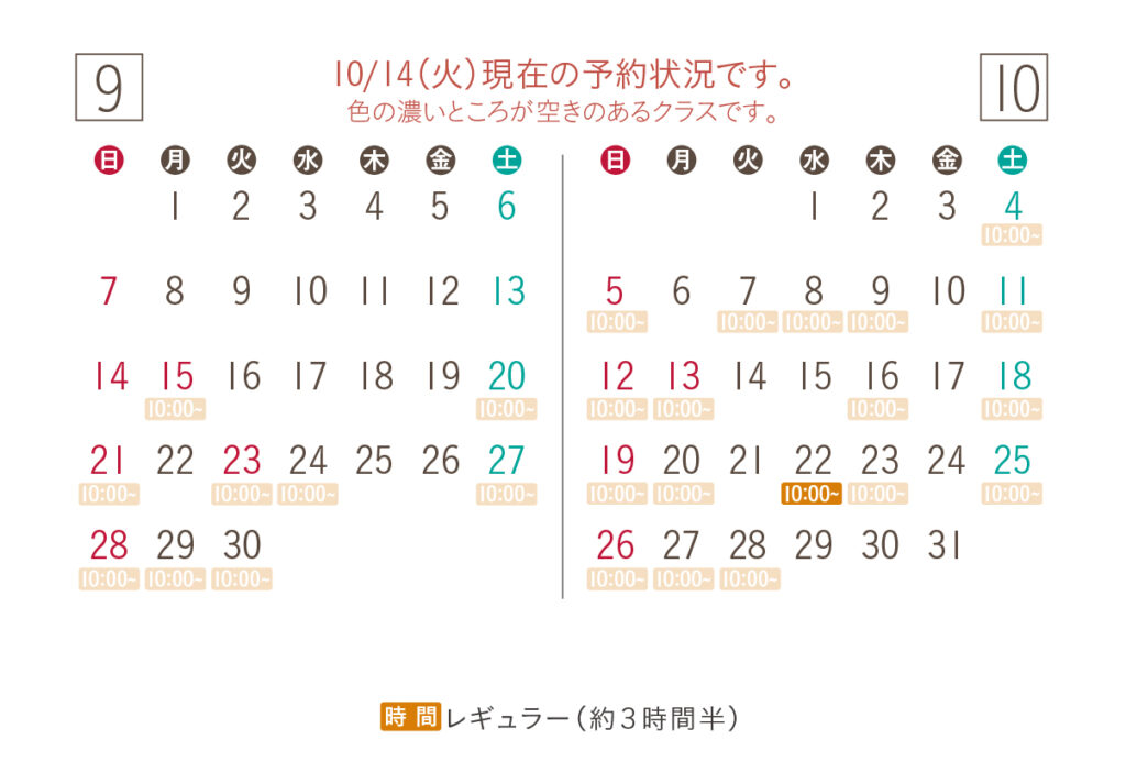 現在の予約受付は9月、10月の教室です。
