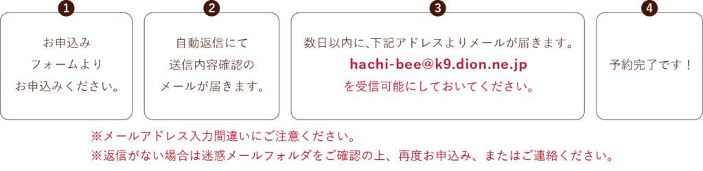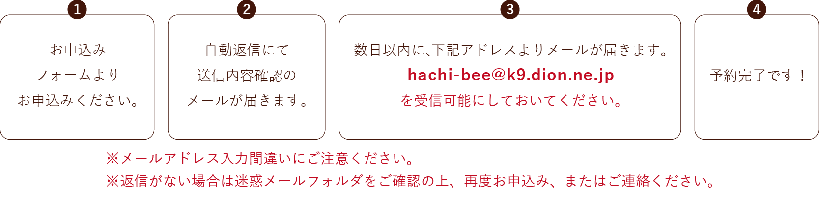 完了メールを「hachi-bee@k9.dion.ne.jp」より返信いたします。数日たっても返信がない場合は、お手数ですが再度送信ください。また、迷惑メールが振り分けられるフォルダやゴミ箱に届いていないか、ご確認ください。