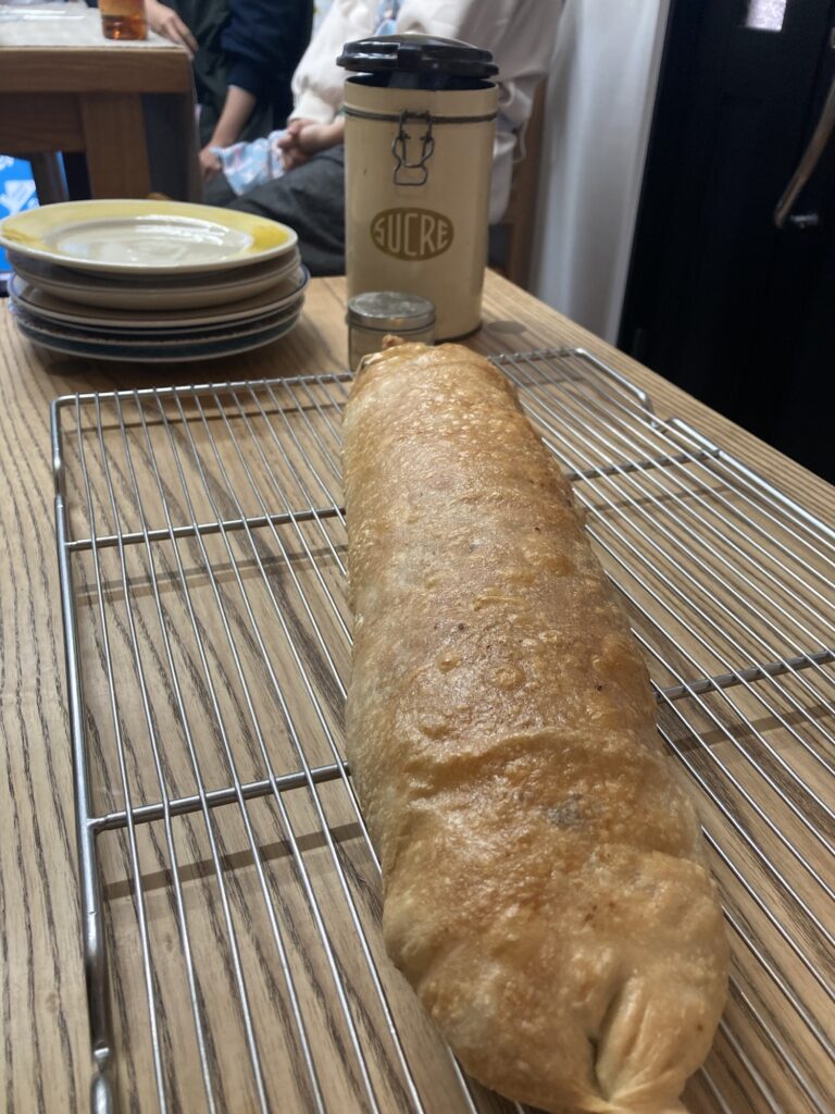 軽食はパリパリ食感のリンゴのおやつ「アップフェルシュトゥルーデル」ドイツのアップルパイ。薄く伸ばした生地に溶かしバターを塗りながら、シナモンシュガーとパン粉、レモン皮と汁をまとわせた紅玉を巻きこみ棒状に成形、両端はキャンデー包みで具材が飛び出さないように。バターの配合も少なくてさっぱり食べれるのと、焼きたての食感がパリッパリで最高に美味しいおやつ。このメニューは過去最多の登場数を更新している。それぐらい皆さんに食べていただきたいので、必ずやまたお披露目したいと思っている。