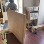 壁面にパネルが貼り付けられていた。事務&倉庫スペースもかなり狭い空間で、三篠の工房でいつも座っている学習机のあたりをイメージして作ってもらった。入り口は扉をつける予定だったけど、開け閉めすると置けるものが少なくな