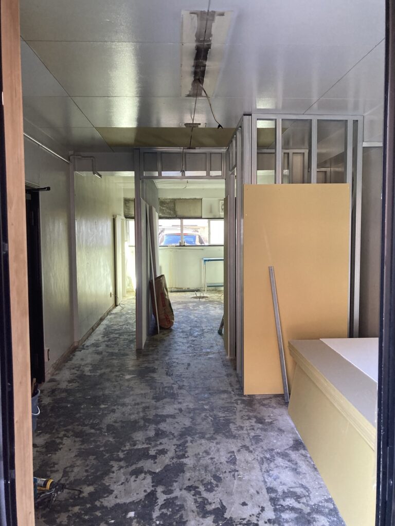 ほんの1日で床材が剥がされ、その後は強そうな鉄の骨組みが現れた。工事現場に立ち会えるのがとても新鮮。縦長の間取りなので、奥がとても遠くに感じる。左側に通路を設けてトイレへいく動線、右手が工房になる予定。真ん中に休憩室、手前がパンを捏ねるスペースになる。ここからどんなふうに出来上がるのかワクワクしかない。西白島町に住んでもうすぐ1ヶ月、とても閑静な住宅街で夜の静けさにびっくりしている。そのおかげもありよく眠れているし、工事にたどり着けた安堵感もある。でも本当にはじまるのはここからで、考えないといけないことがまだまだ山積みだ。